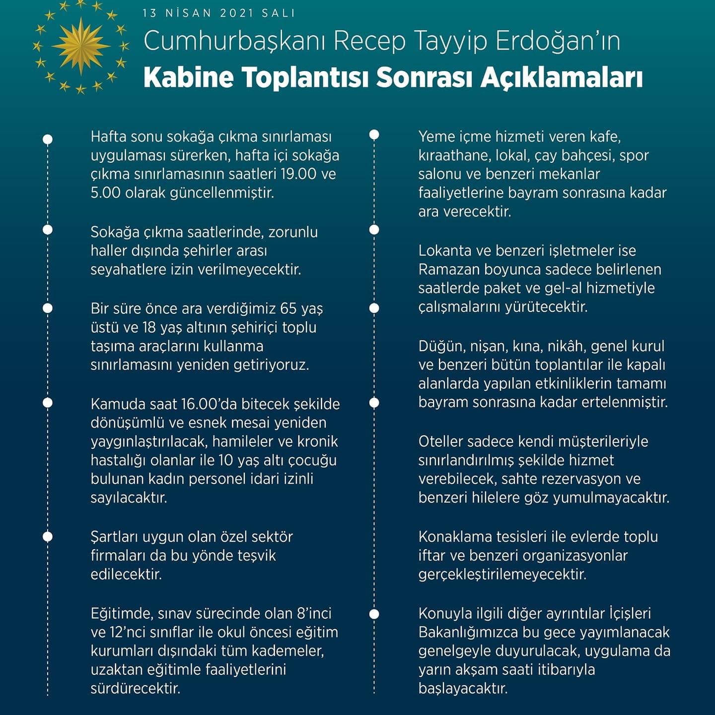 Cumhurbaşkanımız sayın Recep Tayyip Erdoğan, Cumhurbaşkanlığı Kabinesi toplantısı sonrası koronavirüsle mücadele kapsamında alınan yeni tedbirleri açıkladı.
